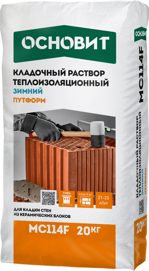 Теплоизоляционный кладочный раствор ОСНОВИТ ПУТФОРМ МС114 предназначен для кладки стен из лёгких пустотелых керамических блоков, блоков из бетона на пористых заполнителях.